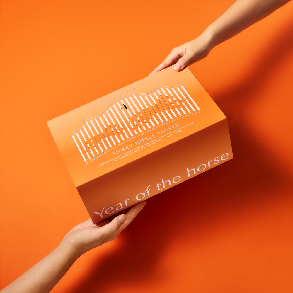 「快樂馬力」新年禮盒,以互動式光柵包裝、馬造型多肉植栽、經典手工餅乾,以及客製錢母,迎接新年祝福「馬上有錢」。