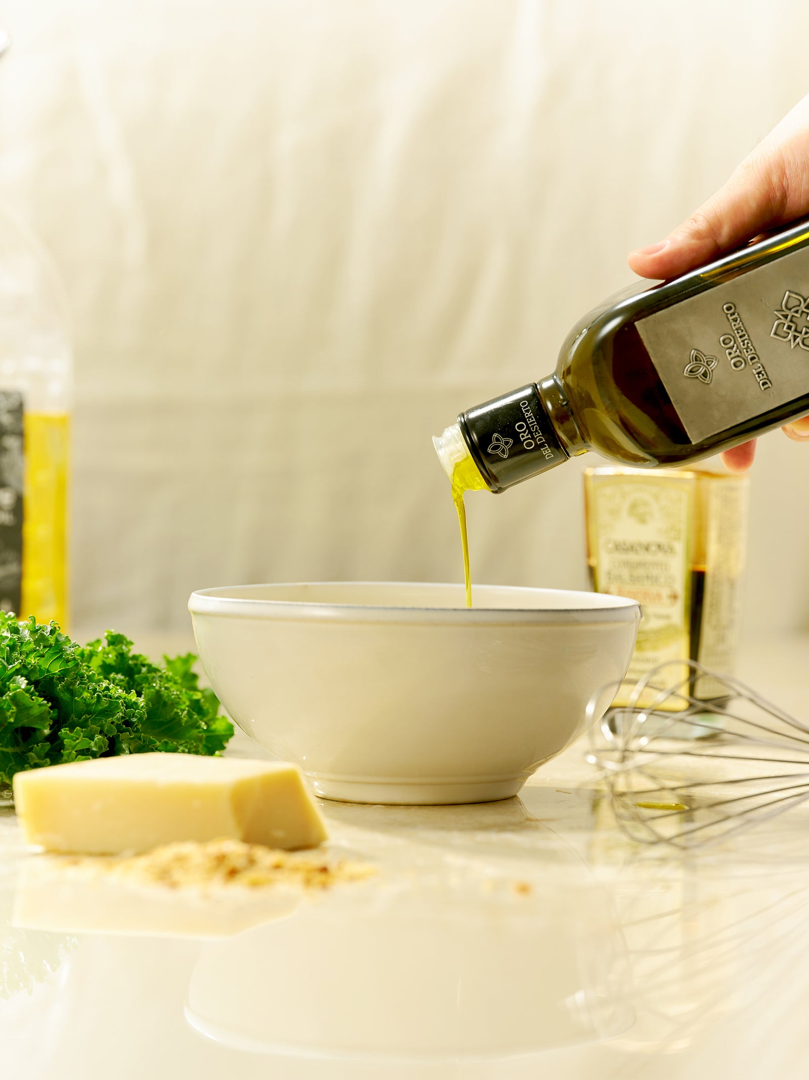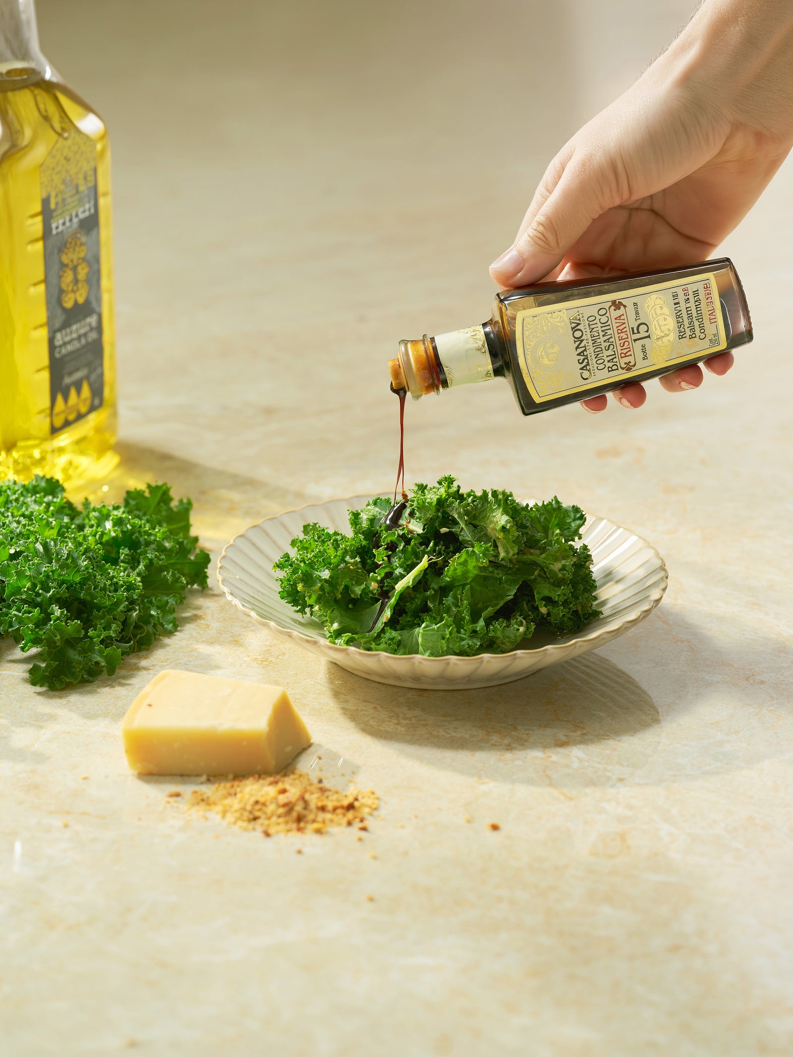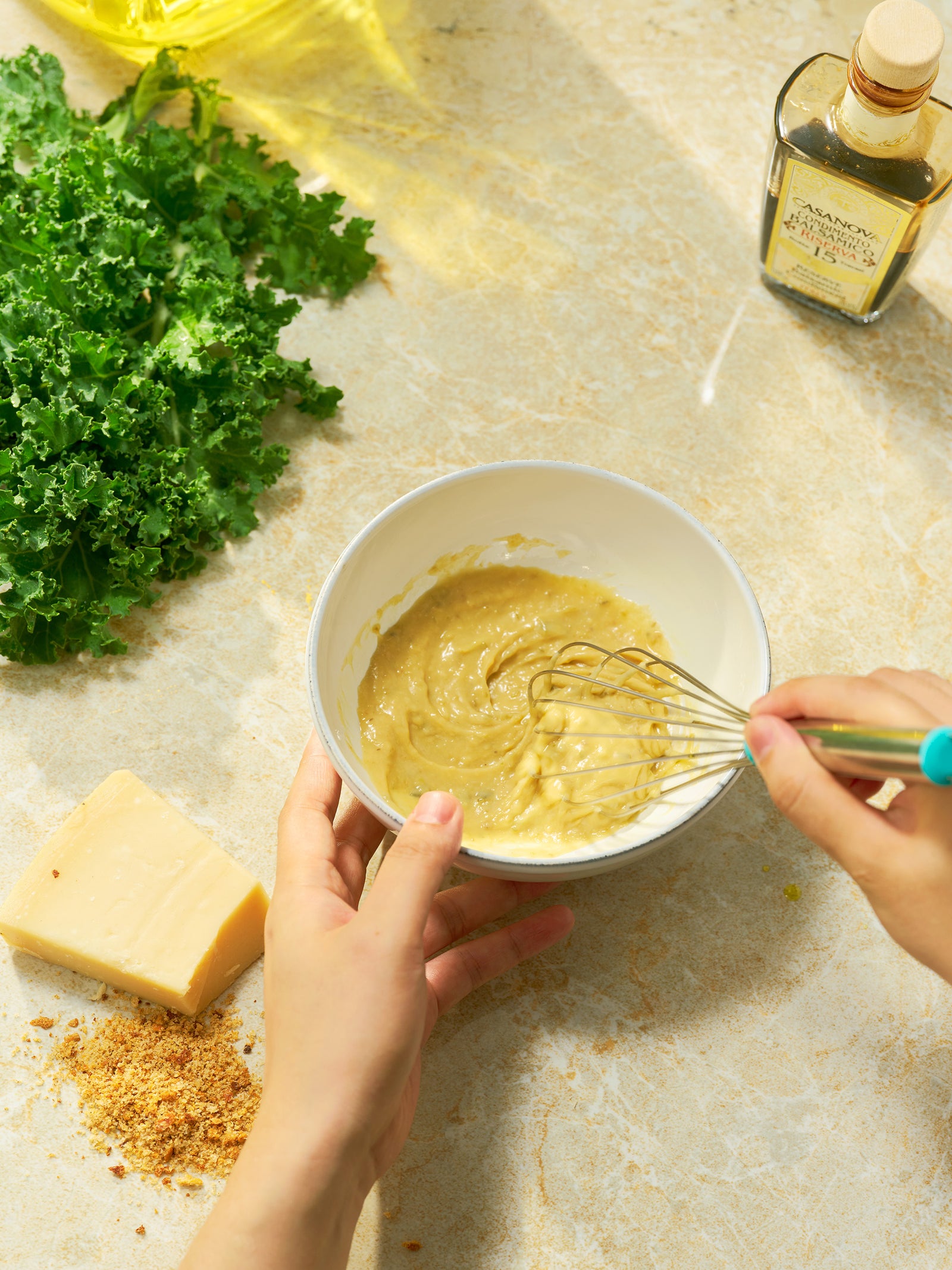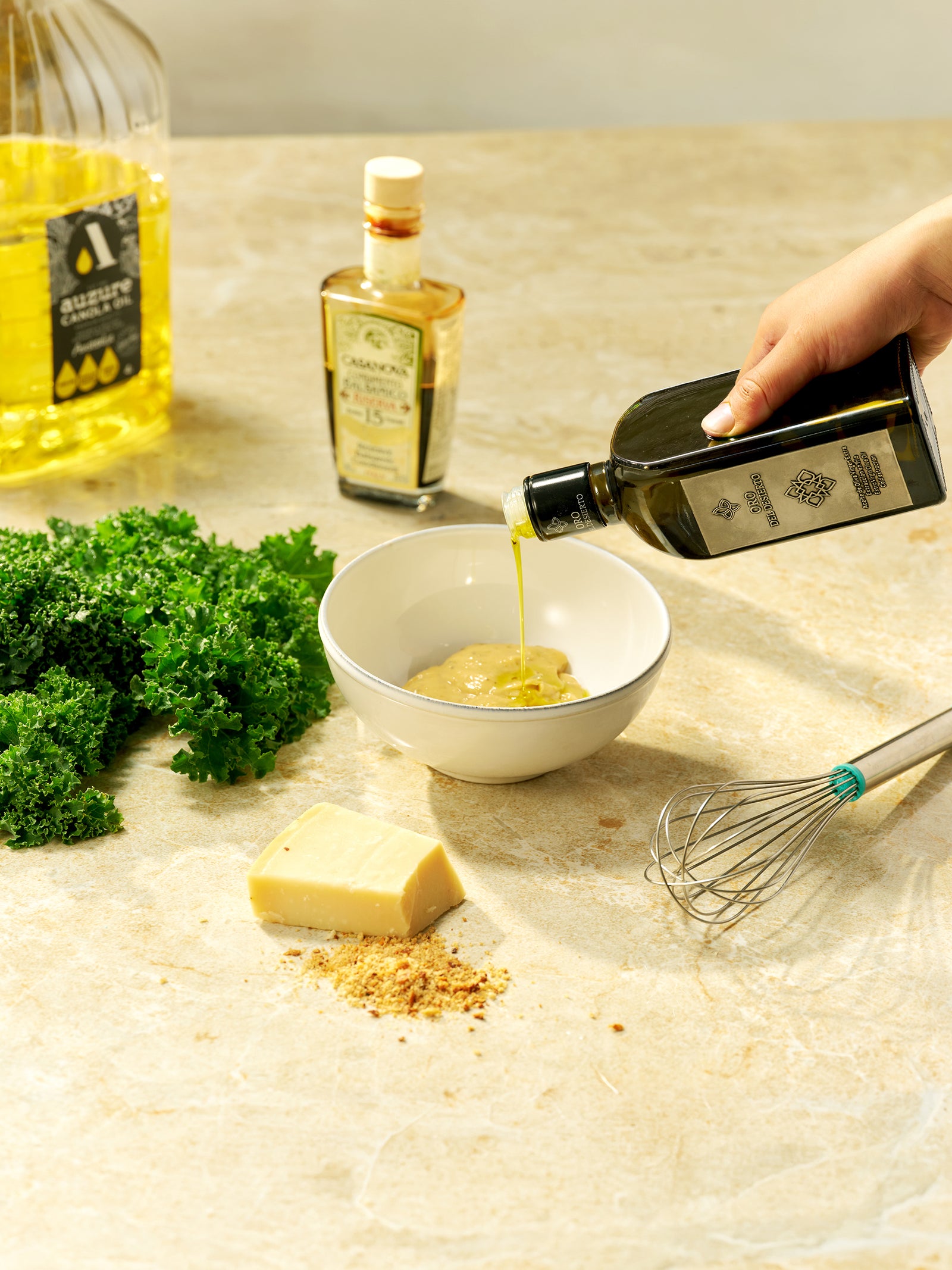 將芥花油、橄欖油與陳年CASANOVA巴薩米克醋均勻拌入,調和出層次分明且細膩柔順的醬汁