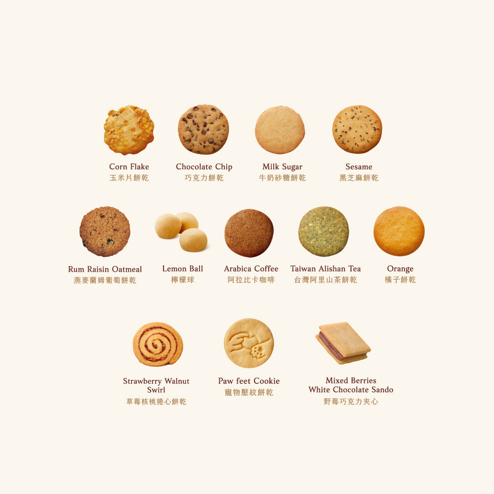 - 餅乾口味:玉米片、阿拉比卡咖啡、橘子、芝麻、巧克力豆、牛奶砂糖、阿里山茶、蘭姆葡萄燕麥、檸檬球、草莓捲心、野莓夾心、寵物壓紋餅乾