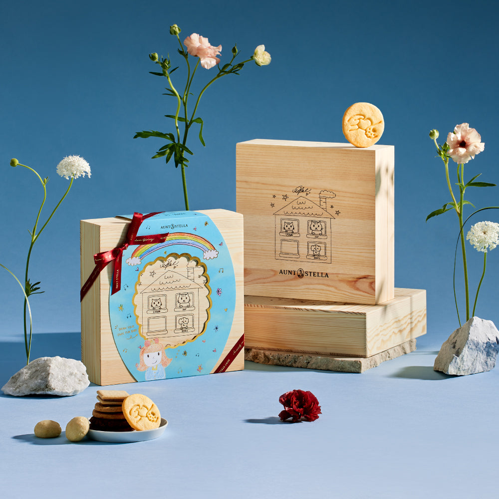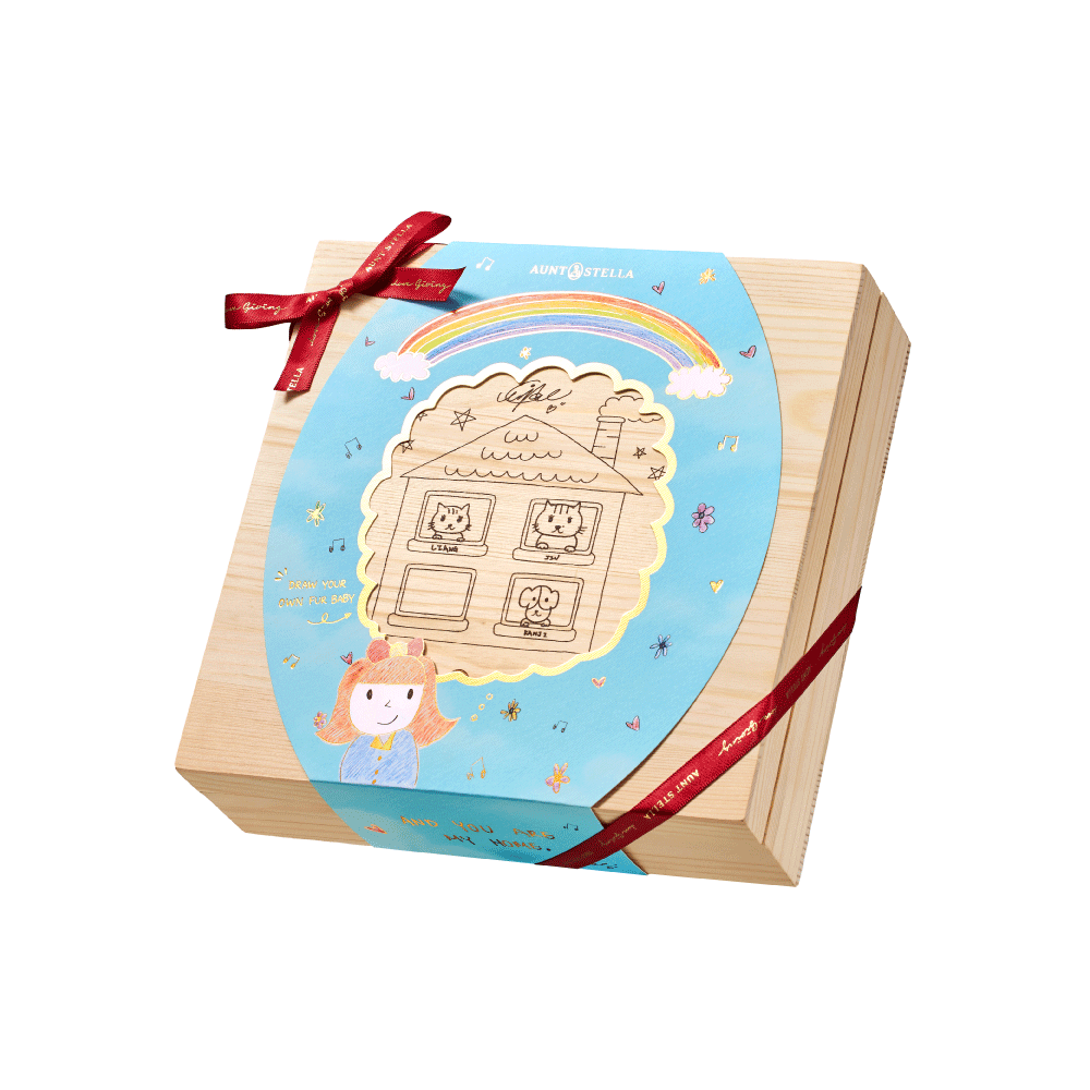 本次聯名由王淨親自參與禮盒設計,將與毛孩相處的日常情感融入創作之中,整體圍繞 「家」的概念延伸,一座溫暖的小屋象徵毛孩渴望的歸屬。窗邊探出頭來的三隻小動物, 正是王淨領養的貓咪阿兩、阿津與狗狗勘吉,牠們從流浪到擁有家的歷程,也成為此次 創作的重要靈感來源。