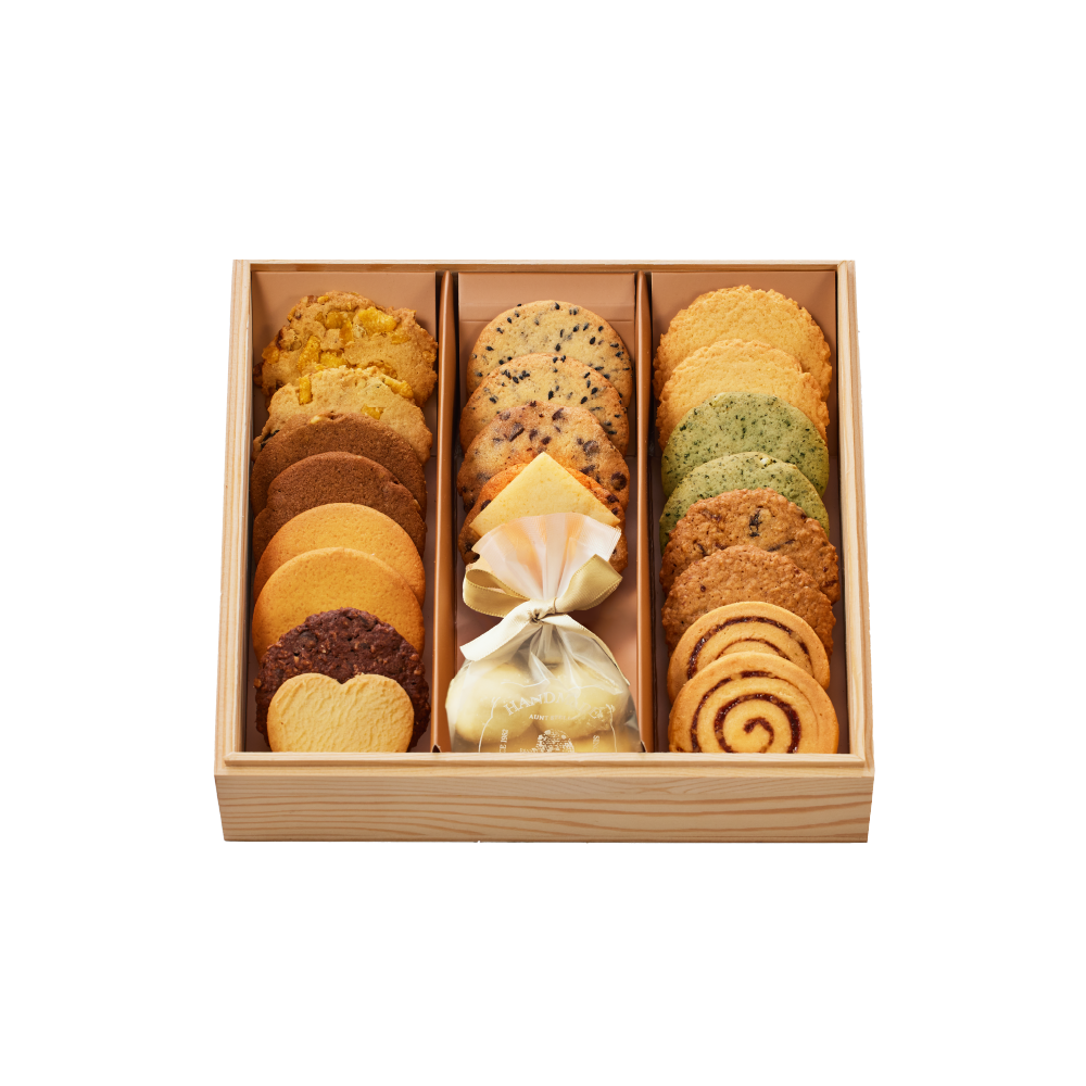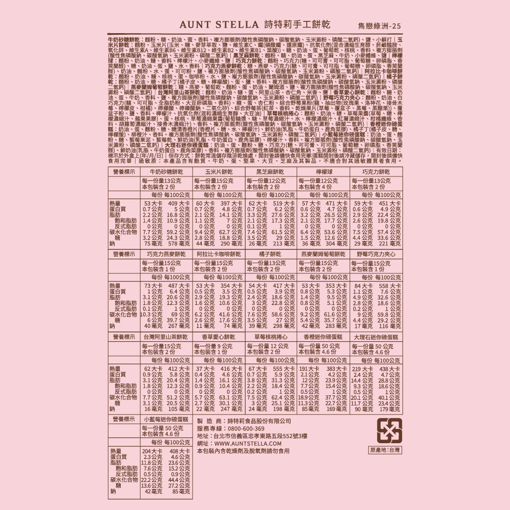- 餅乾口味:牛奶砂糖、芝麻、巧克力豆、巧克力燕麥、玉米片、橘子、阿拉比卡咖啡、檸檬球、香草愛心造型餅乾、蘭姆葡萄、阿里山茶、草莓捲心、野莓夾心