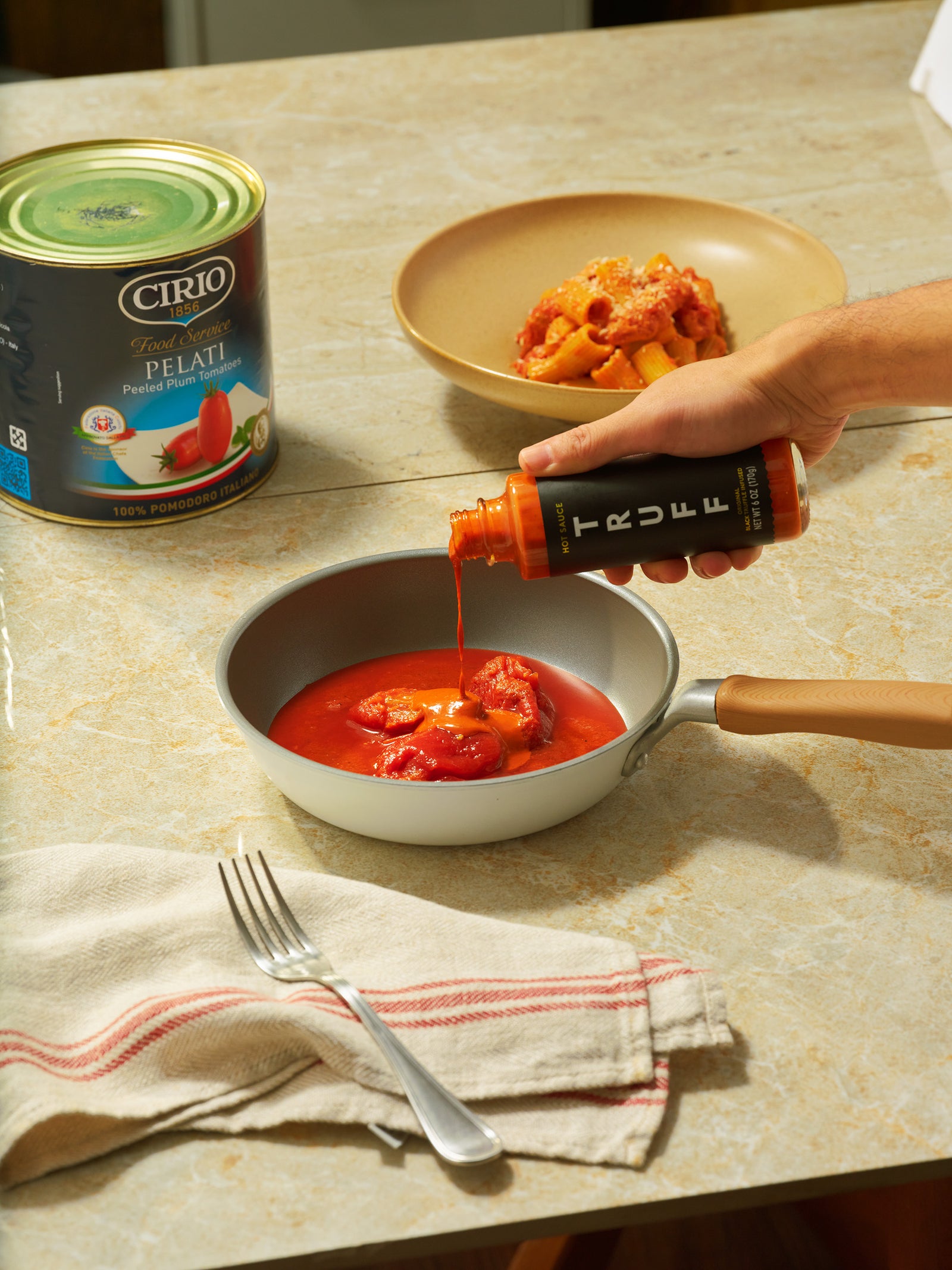 以濃郁番茄醬汁為風味基底,慢火熬煮出酸甜平衡的義式經典層次,Q彈飽滿的水管麵完整包覆醬汁精華,微辛尾韻融合迷人松露香氣